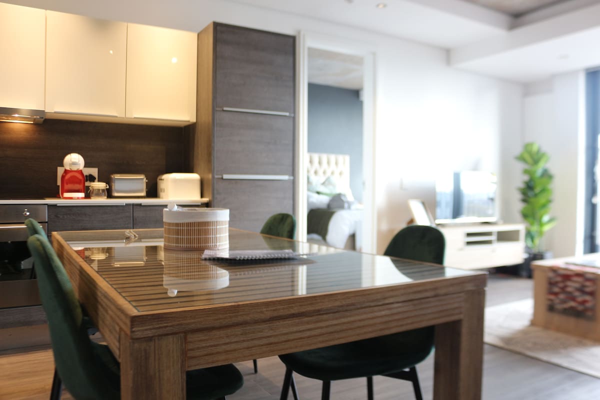 Enjoy stunning ocean sunsets and a spectacular view of Table Mountain from our newly renovated 2 bedroom apartment. Our apartment is within walking distance to the beach & 8 km drive from the city centre, making it the ideal place for a family getaway or business traveler. At 124m² (excluding a private laundry area) our modern apartment offers plenty of space to relax & can quite comfortably accommodate 4 guests. Fast Fibre Internet, Netflix & Apple TV. Back-up power inside apartment & for lift!