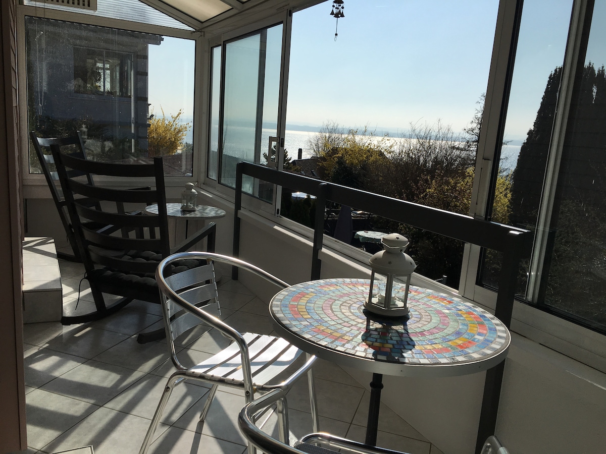 展館位於歷史區的中心。坐落在塔維隆內,享受非凡的景觀,是一個神奇的地方。 您可以在鬱鬱蔥蔥的花園中欣賞這座湖和聖皮埃爾島的美景。 客廳設計巧妙(沙發牀) ,在小空間( 12平方米)為您提供極佳的舒適性。 探索我在埃拉赫的第二個廣告:夢想,在老城中心。 翻修75平方米的Loft ,配有花園。