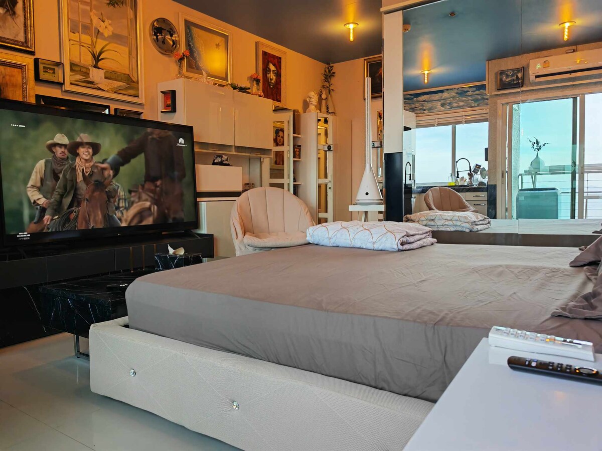 高樓層(22樓)-位於芭達雅市中心的豪華公寓,距離海灘僅一個街區。 雙人床尺寸。 工作空間。 房間和公寓內有高速 WIFI。 在舒適的空間享受所有舒適,欣賞海灣的美麗景觀。 公寓提供咖啡機、洗衣機、工作空間和所有廚具。 提供保險箱。 臥室內有高畫質有線電視和NETFLIX。 享受泳池、桑拿、按摩浴缸和蒸氣浴。 公寓內設有健身中心。