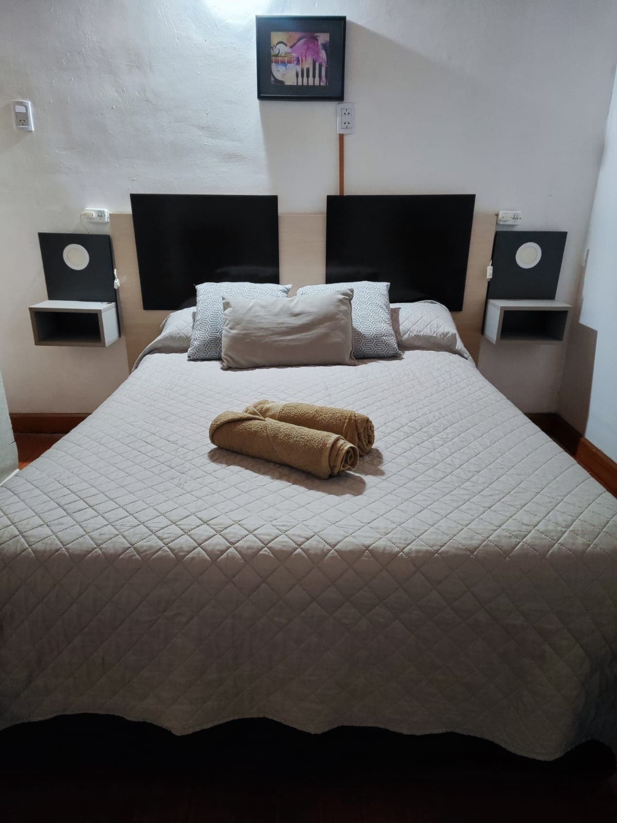 Casa de 2 plantas En planta baja: cocina comedor, ante baño, baño. Patio con parrilla. Primer piso: Un amplio dormitorio con 1 cama de dos plazas y tres camas de una plaza con aire acondicionado y Tv. En el medio del dormitorio, un placard dividiendo los sectores para dar privacidad entre la cama matrimonial y las otras camas. Ubicada en un barrio tranquilo, a 1 km del centro. Cuenta con servicio de wifi Ropa de cama, toallas y toallones. Estacionamiento dentro del predio al aire libre.