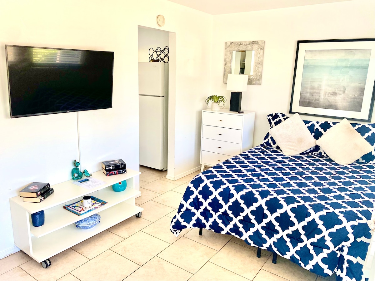 Escape to our modern Pacific Beach studio, the perfect San Diego retreat for two! Just a 5-min walk to the bay & 15-min to the ocean, this stylish space features a private patio, kitchenette, & cozy fireplace. Enjoy easy self check-in and walk to Garnet Ave's vibrant shops & nightlife. Your ideal beach getaway awaits!