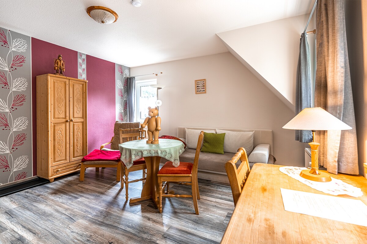 Our smallest apartment "Scheibenberg" on the ground floor: - Size: 39sqm - Occupancy of 1-4 people, 1 separate bedroom with box-spring double bed, open living area with kitchenette fully equipped with fridge, ceramic hob with oven, coffee maker, toaster, kettle, dining area up to 4 people, optional sofa bed with topper, 2.00mx1.65m, Flat TV, bathroom with shower and toilet, cosmetic mirror and hairdryer, baby bed and high chair, dog after registration 8, - Euro per day