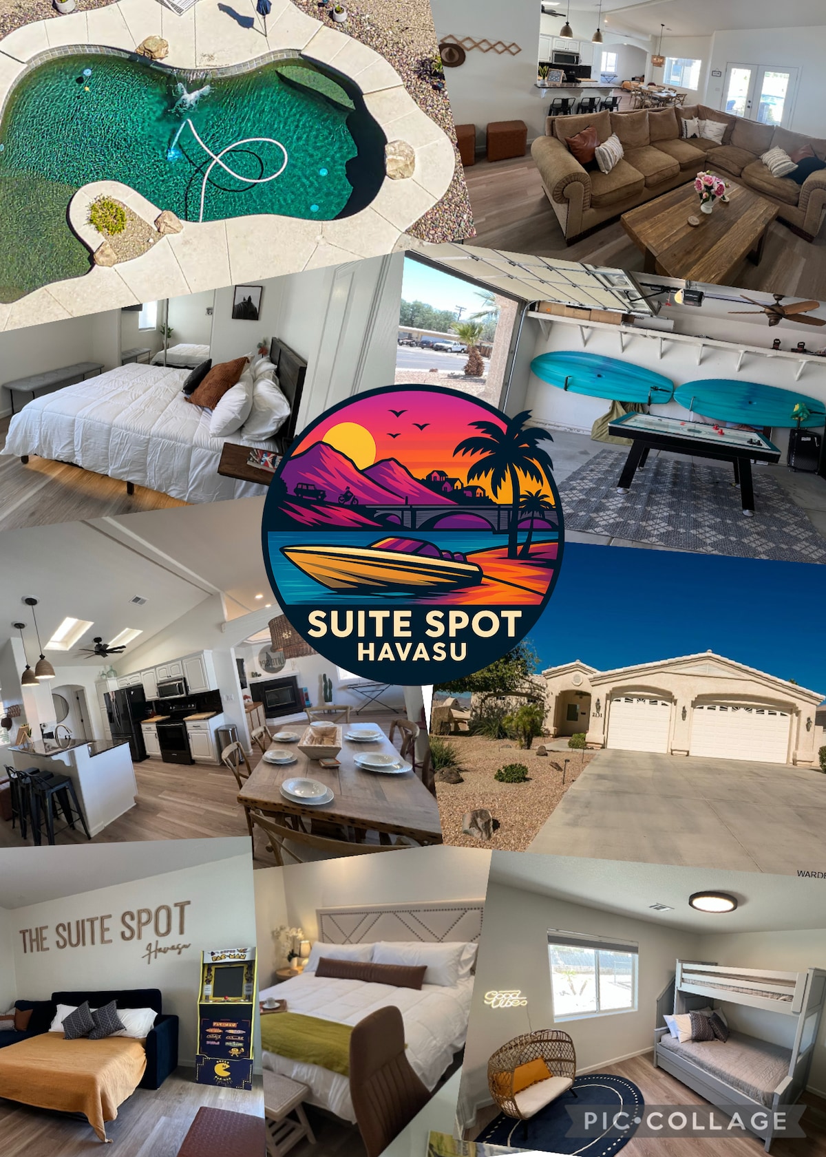 這個3臥室家庭友善的房源位於市中心,離什麼都很近。距離Rotary Park的海灘1/2英里,距離倫敦橋1英里,距離哈瓦蘇湖碼頭2英里。 配備1張特大床和2張雙人床。 (可容納6人)美麗、寵物友善、完全圍欄的後院非常適合日夜娛樂,配有枝狀吊燈和頭頂照明。 其他功能包括舒適的火坑、烤肉架、Traeger燻燒器、休息露臺和果嶺。 有很多額外的停車位,可停放玩具。