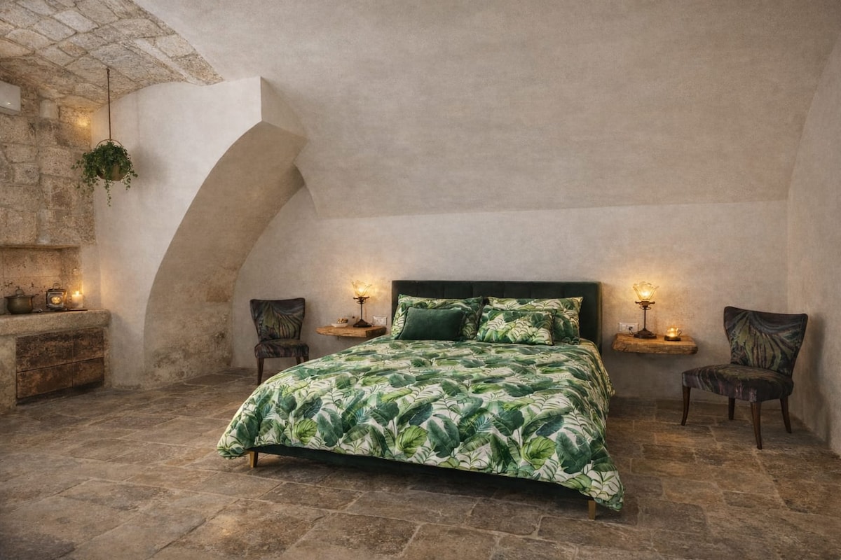 In the heart of Molfetta’s Historic Center, Room 2 is a 35 sqm independent loft for 2 guests, with a double bed, wardrobe corner, and private bathroom. Features exposed stone, vaulted ceilings, and original tiled floors, with a decorative antique well. Equipped with fridge, coffee machine, and kettle for herbal teas. Guesthouse: breakfast not included.
