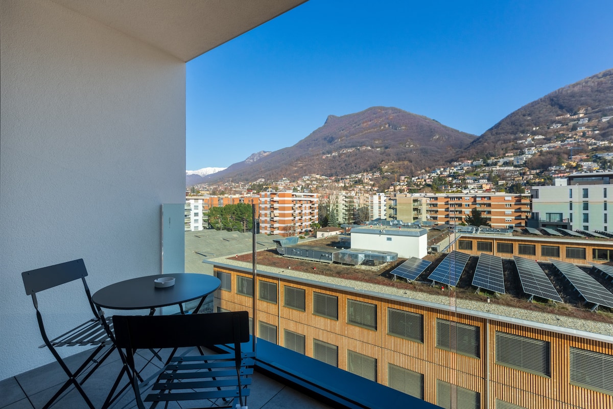 Stylish contemporary studio apartment in the university heart of Lugano, ideal for short or long stays. The apartment offers a perfect balance between comodità and design, featuring a furnished balcony and a fully equipped kitchen. The building includes a free gym, communal laundry facilities, and video surveillance. Breakfast service can be included for monthly contracts, with additional services such as cleaning and laundry available upon request.