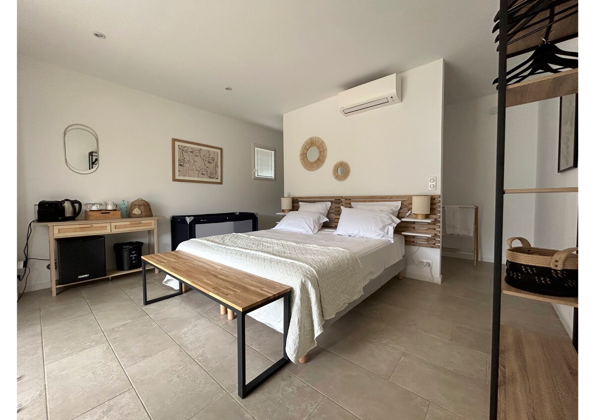 Patios Di Pruno vous propose une suite de 28m2 pouvant accueillir deux personnes. Cette chambre spacieuse, climatisée, dispose d'un lit King Size et d'une grande douche à l'italienne. Elle comprend également un espace collation avec une machine Nespresso, une bouilloire et un mini frigo. Terrasse couverte de 15m2 avec petit salon de jardin. Wifi ainsi qu'une place de parking sont gratuits. Petits déjeuners proposés. Logement proche de l'aéroport ainsi que des plages et sentiers de randonnées.
