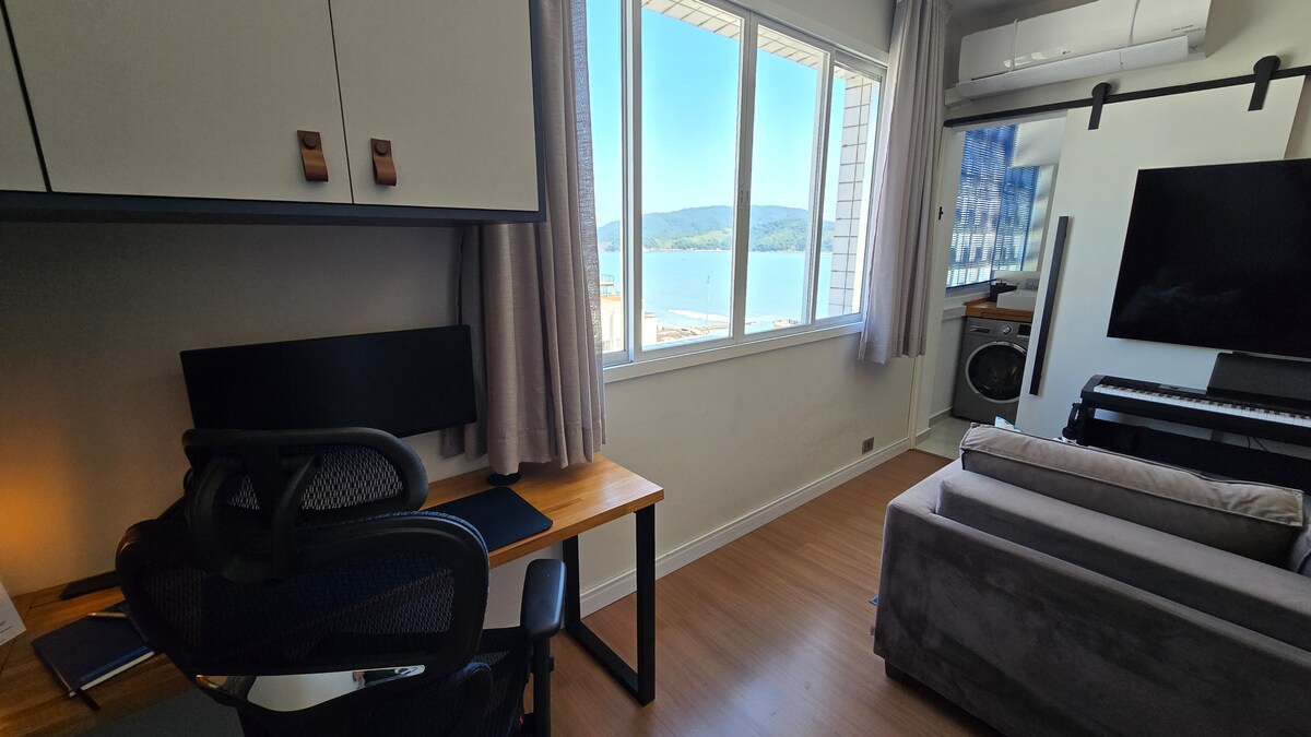 全新翻修的Loft ,可欣賞免費海景,位於著名的波查特島( Porchat Island )上。 自助入住,配有電子鎖、空調、餐具和全套廚房。 500兆網路、有線電視和智慧型三星電視。 Dolce Gusto 多種飲品機。Alexa。 Fogão、迷你吧、電動烤肉、芙蓉鍋、空氣炸鍋和三明治。 牀單和吹風機。 每隻寵物 R$100。 熨衣服。 220v Outlets和OMO洗衣店和迷你市場24小時。 基本價格2人
