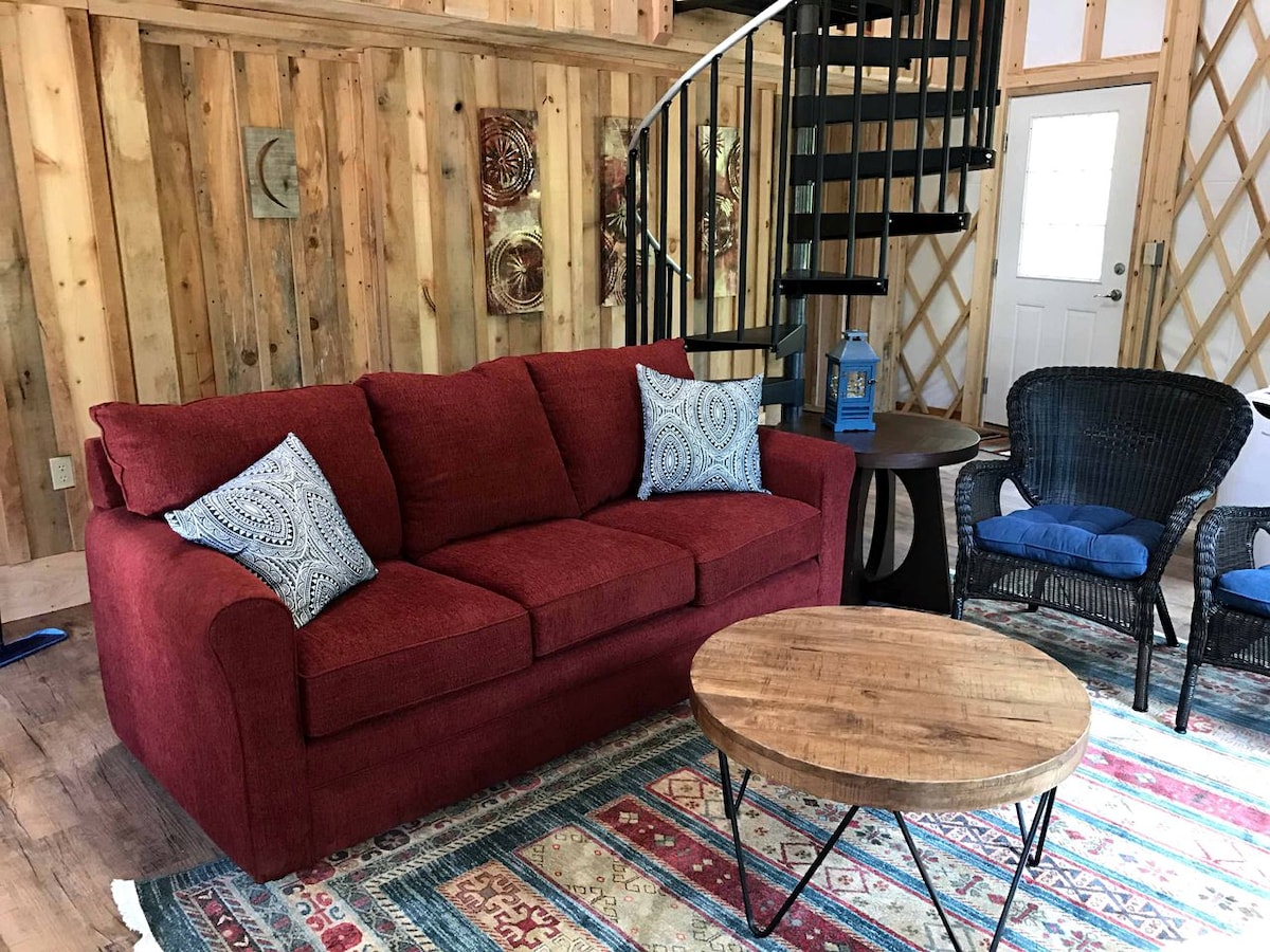 Glampers are invited to enjoy a stay in this quirky yurt rental set on the banks of the New River in Virginia. The yurt can sleep a total of six guests as there are a range of bed options to suit the needs of the group. All of the beds are dressed in comfortable linens to ensure that guests can sleep peacefully. The rental also has its own bathroom for guests' convenience. The yurt is bright and spacious and, downstairs, glampers will find the cozy living area that offers comfy couches