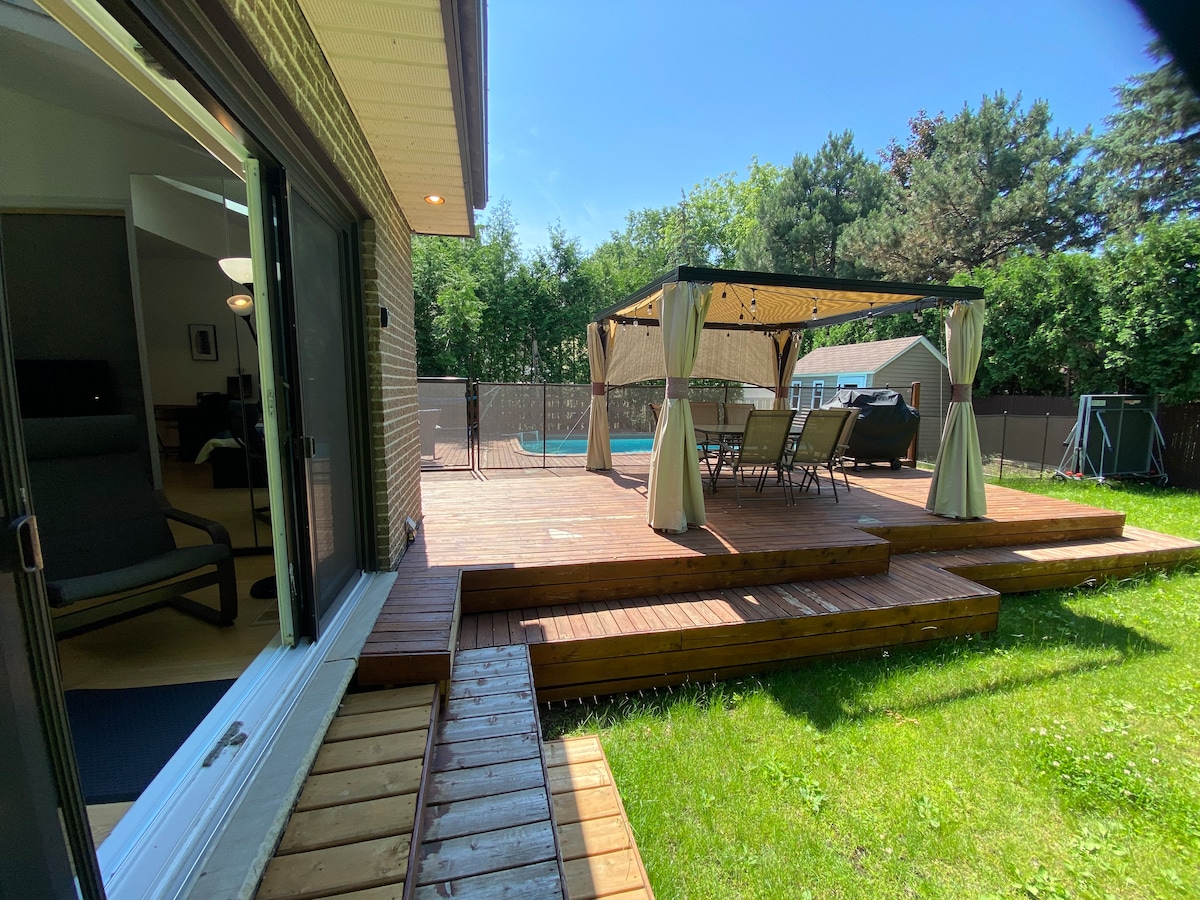 /!\ May-June: pool and parts of the deck will not be available for a few days due to renovations /!\ Independent suite with kitchenette, bathroom, and office nook. Located on the ground floor of our house in a quiet and safe residential area. Bright accommodation with a view of the backyard garden. Outdoor spaces and amenities (pool, patio, BBQ) shared with the homeowners. Free and secure street parking in front of the house. Montreal is 25 minutes by car and 40 minutes by public transit.