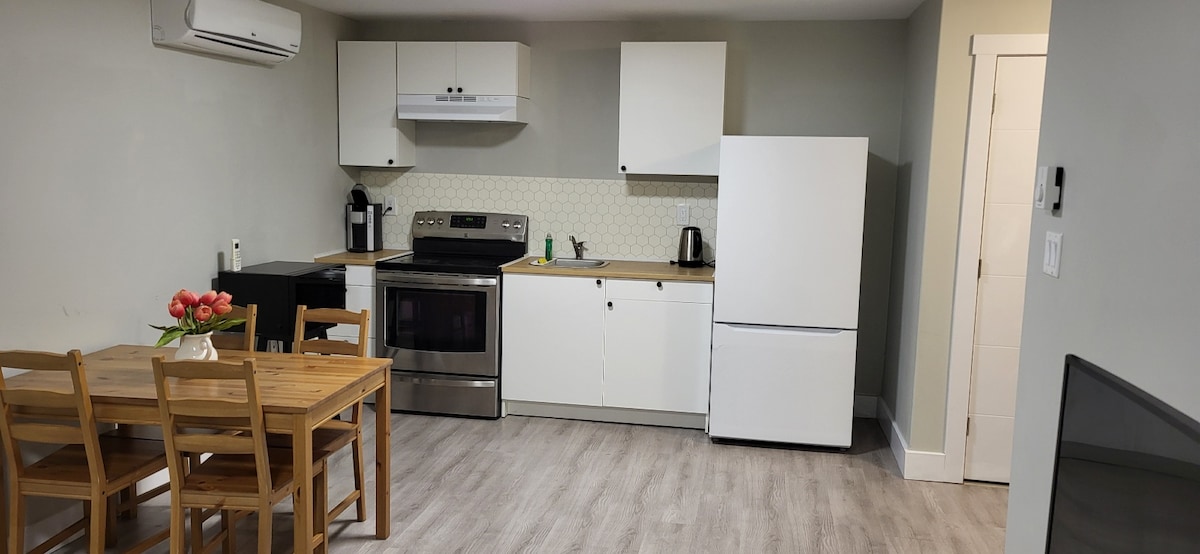 Welcome! Looking for a weekend getaway or a home away from home? Our clean, stylish suite, located in the heart of Crichton Park will give you a very comfortable stay. Just 4 minutes from Mic Mac Mall, 6 minutes to Dartmouth Crossing, walking distance to popular Dartmouth coffee shops, restaurants, bars and beautiful Banook lake. Enjoy high speed internet, smart TV, oversized shower, custom kitchenette with microwave, sink and optional cooktop. Close to Shubie trails and shopping.