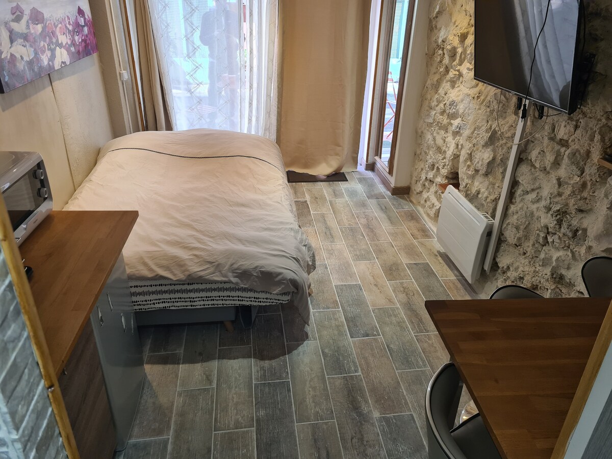 Petit studio meublé non fumeur situé au rez-de-chaussée de notre habitation au centre du vieux village (attention le réseau téléphonique peut un peu perturbée tout dépend votre opérateur .donnant sur la rue piétonne accessible en véhicule pour les riverains et nos voyageurs le temps de déposer vos bagages.Table avec 2chaises devant le logement.Un canapé lit et son matela Bultex, ( Attention auteur sous plafond 1M85en moyenne) Salle de bain attenante.