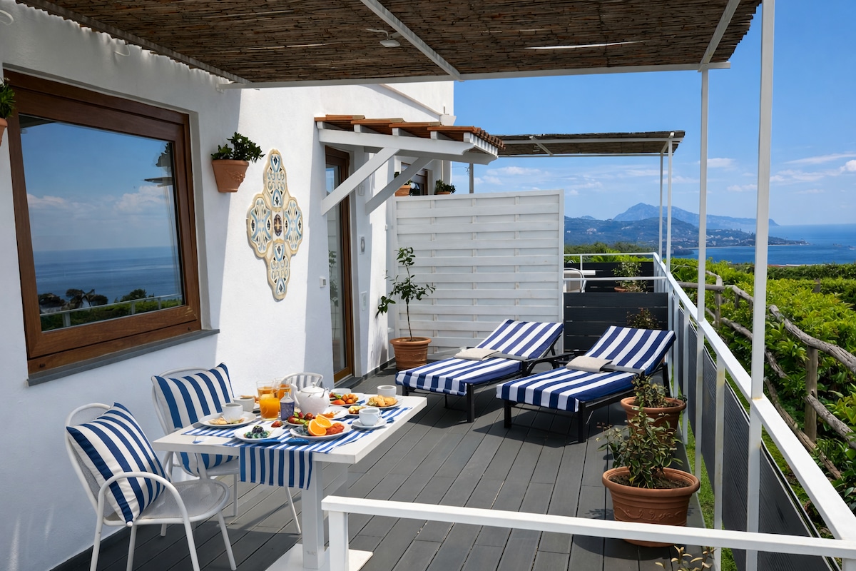 Situato in Penisola Sorrentina (Na), il Bella Vista House offre uno spettacolare terrazzo a picco sul mare, da dove si ammirano le isole del golfo Capri, Ischia e Procida! La casa è suddivisa su due livelli, con ingresso, bagno, cucina completa, zona living con divano letto (2 posti), terrazzo attrezzato, al secondo livello collegato da scala a chiocciola, c'è una grande camera con letto matrimoniale e ampia finestra sul mare. La casa offre tv, wifi, aria condizionata e parcheggio