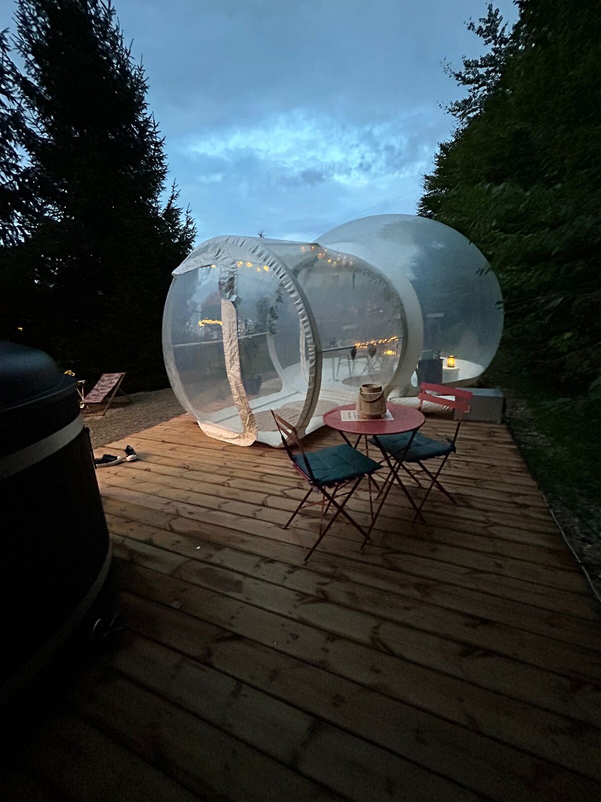 Vivez une expérience unique AU GITE LA CLE MONTENOIS dans un dôme perché à 2,40 m de hauteur, avec façade transparente pour admirer la nature et un espace salon cosy dans une bulle vitrée en pleine forêt. Profitez d’une vue imprenable sur les arbres et d’un accès exclusif à un bain nordique privatif. CLAQUETTE DE BAIN OBLIGATOIRE Le petit-déjeuner est inclus pour un réveil tout en douceur. Pour rendre votre séjour encore plus inoubliable, choisissez l’option romantique ou autre : (sur demande).