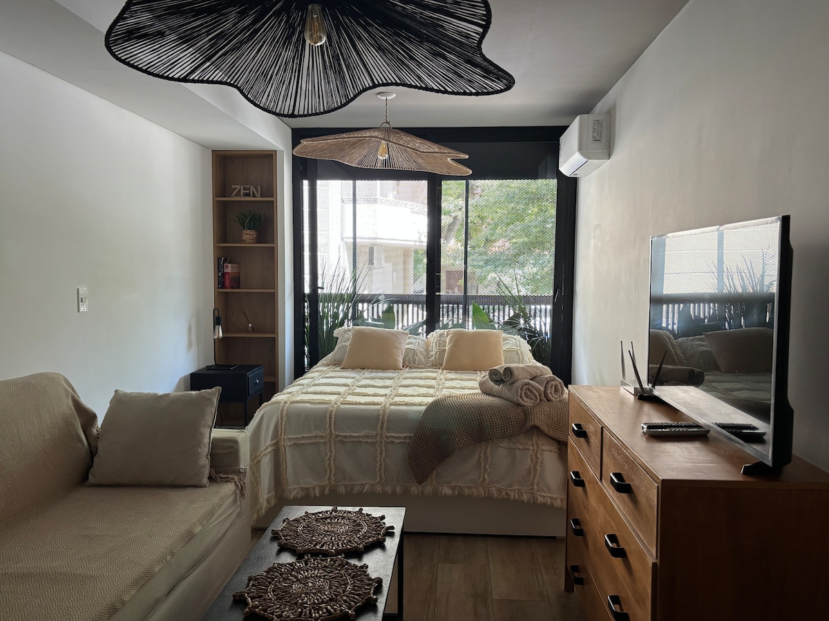 Moderno alojamiento en el corazón de Pocitos. Amplio Studio tipo Loft. Cocina comedor totalmente equipada, living con cómodo sofá, TV Led Smart, Aire acondicionado. Dormitorio con sommier matrimonial y placard. El apartamento se encuentra a solo cuatro cuadras de Playa Pocitos. En las inmediaciones: Centro comercial (shopping center), supermercados, farmacia, bares, restaurantes, pubs, movida nocturna, etc.