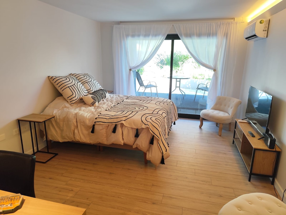 在這個安靜且位於市中心的空間放鬆身心。實用的全新公寓,一樓光線充足。位於一條非常安靜的街道前面。設備齊全:帶冷凍櫃的冰箱、烤麵包機、微波爐、電熱水壺、咖啡機、內置電烤箱、爐子、抽油煙機、智慧電視、空調、熨斗和吹風機。客廳配有整合式廚房和套房臥室。全套浴室。大樓設有帶烤架的露台。