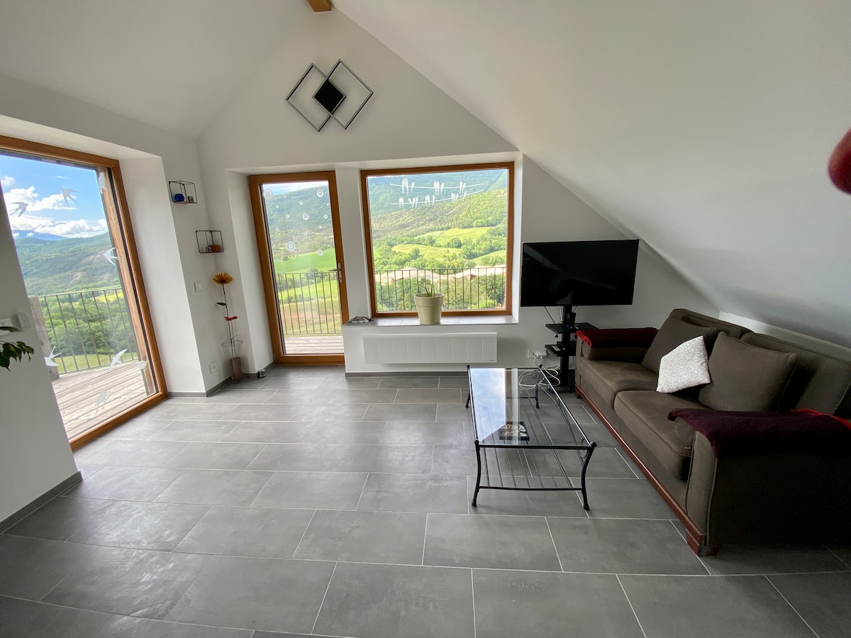 This appartment located on the first floor of our house but completely independent, will offer you a breathtaking view of the mountains and absolute calm. Ideal for hiking or cycling in all seasons, skiing, climbing, rafting, water activities but also for total relaxation or creative activities. Lake Serre Ponçon is 5 km away and the Écrins National Park is 10 km away.
