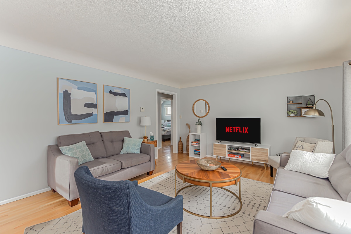 整套房源僅供您使用。2床1.5浴室。廚房、洗衣房和許多便利設施 位於市中心;距離市中心、i29 和 i94 不到 5 分鐘車程。安靜的鄰居 2間臥室;一間配有加大雙人床,一間配有標準雙人床。客廳內有折疊式沙發床,如有需要,也可提供地板床墊 室內:硬木地板、開放式佈局、2人日本式步入式淋浴間,配有大型浸泡浴缸 外面:甲板和烤架,可容納4人 客廳配有 58 吋智慧電視,臥室配有電視,可插入 Roku、Firestick 等