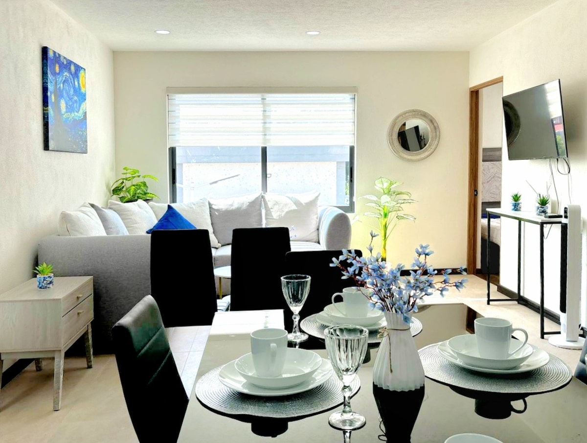 享受位於莫雷利亞 Lomas de Santa María 獨家社區的現代公寓。公寓有兩間臥室(一張加大雙人床和兩張單人床)、三間半浴室、配備爐子、咖啡機和微波爐的廚房。此外,您還可以使用私人車庫、洗衣機和烘乾機,享受更多的便利。位於安靜的區域,距離歷史中心僅 15 分鐘。靠近醫院、學校和商場。非常適合尋求舒適與時尚的家庭或團體。