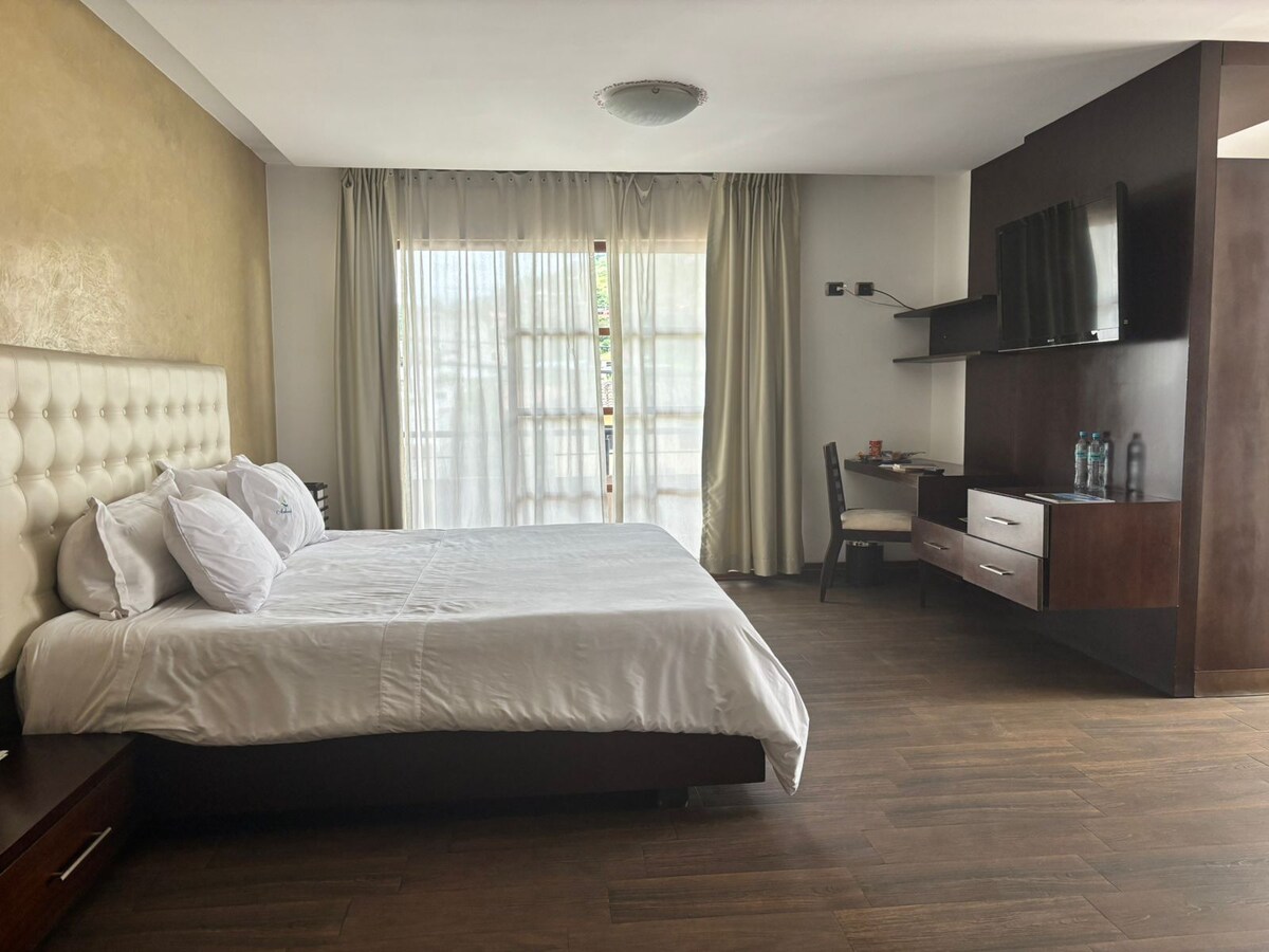 Enjoy maximum comfort in our elegant Deluxe Double Room, designed to offer a superior rest experience. This spacious accommodation combines modern style with cozy details, creating the perfect atmosphere for both leisure and business trips. It features a private bathroom with hot water, a flat-screen TV, and high-speed Wi-Fi. The large windows allow plenty of natural light and offer a pleasant view, ensuring a truly relaxing stay.