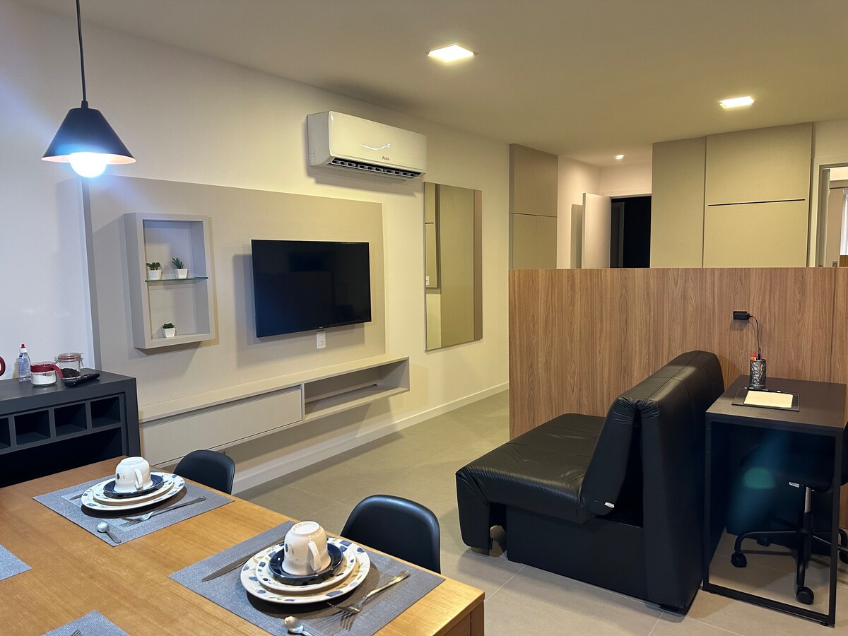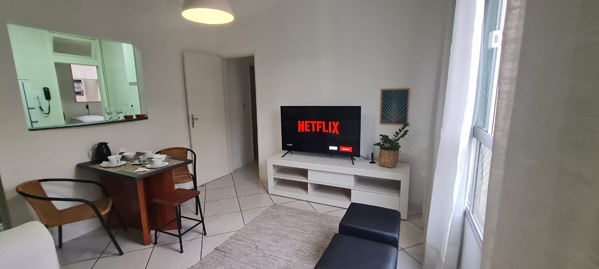 🔥 新奇:在這個房源中,您在沒有興趣的情況下在6倍內安裝您的預訂! 🔥 全新安全大樓的1間臥室公寓,臥室/客廳有空調, 1個車庫位置,位於Barro Vermelho -一切都近在咫尺! 它有1張雙人牀、1張沙發牀、1間浴室、牀單和浴室,可供所有房客使用。 大樓設有24小時現場櫃檯。 參觀大勝利的觀光巴士。
