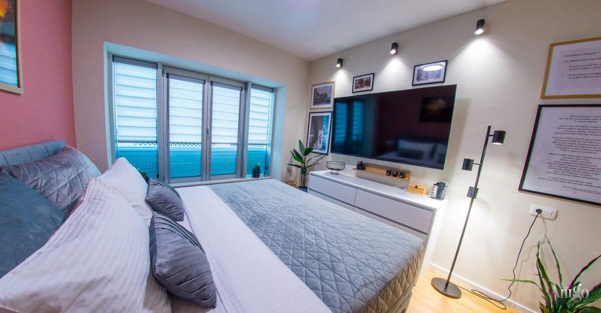 Enjoy a stylish experience at this centrally-located place in brand new building.The apartment consists of a bright bedroom with a comfy king-sized bed, dinning table for 4 persons and modern fully equipped kitchen. A sunlit living room with Smart TV. The pull-out corner in the living room can also serve as an additional bed for 2 more guests. The entire apartment was designed by architect (Adil Glavovic - axisarchiteture)