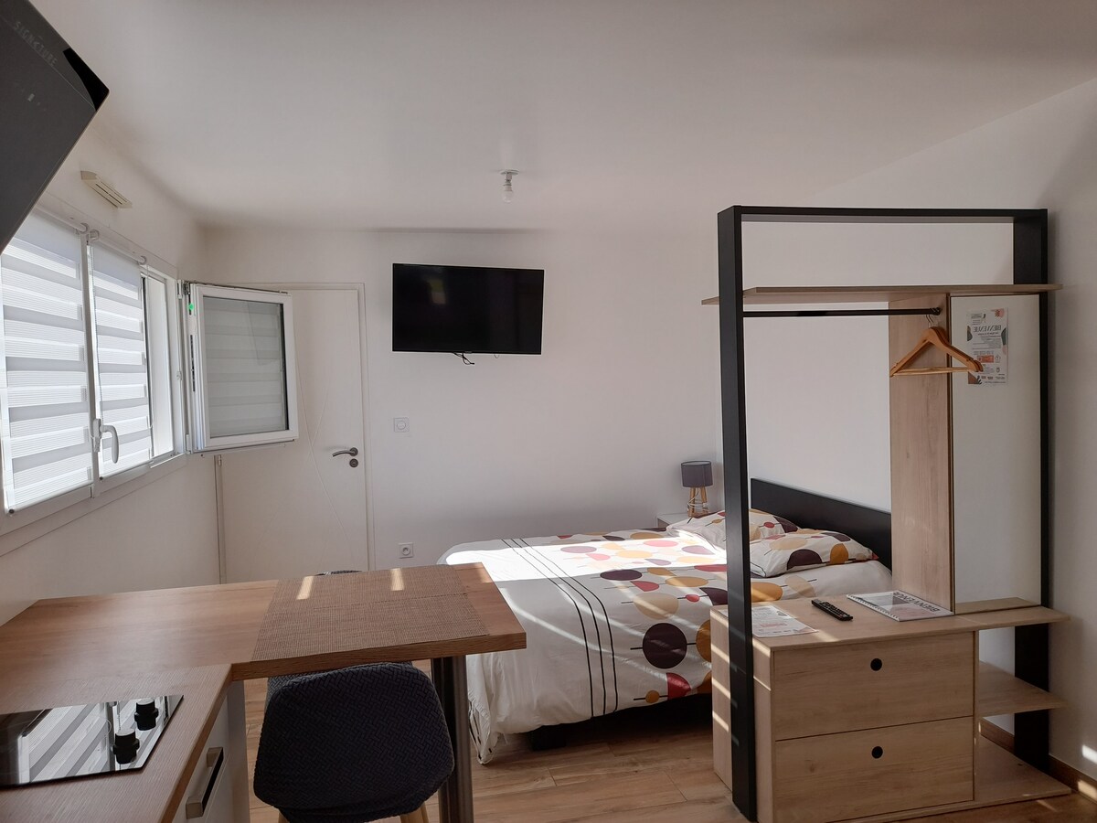 BIEN LIRE L'ANNONCE!!! Que ce soit pour un déplacement professionnel ou pour un séjour seul ou à deux, vous pourrez profiter de notre studio tout équipé. L'accès indépendant et autonome vous donnera une liberté dans vos horaires; vous trouverez tout le nécessaire à proximité, autant pour des activités, restaurants ou vos courses ainsi qu'un parc a 2 min a pieds. Le logement se situe à 15 min de La Roche sur Yon ( à 10 min du Vendespace), à 30 min des Sables d'Olonne et à 55km du Puy du fou.