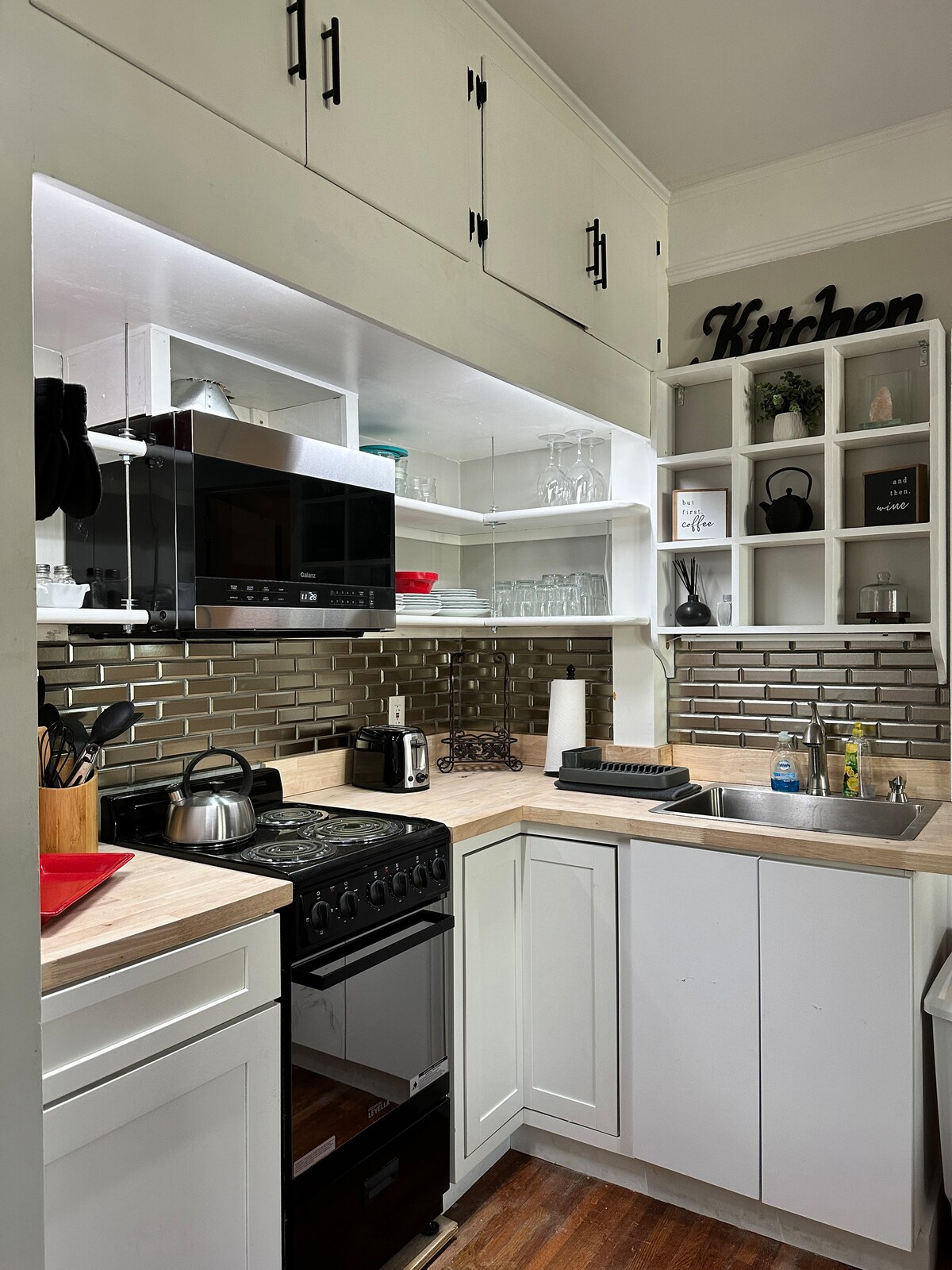 You'll love or Carriage House. Full kitchen with oven, French door refrigerator, stove, microwave. Has an island where you can eat or a dining table with 4 chairs. Washer and drier. Dedicated workspace. Large sectional sofa and coffee table. Entertainment includes 55 in Smart TV & High speed internet Queen bed & all linens. Also cotton sheets Bath has walk in frameless shower. Entire space is well lit. A place you'll visit again & again. Comfort in the country. We welcome you to our place.