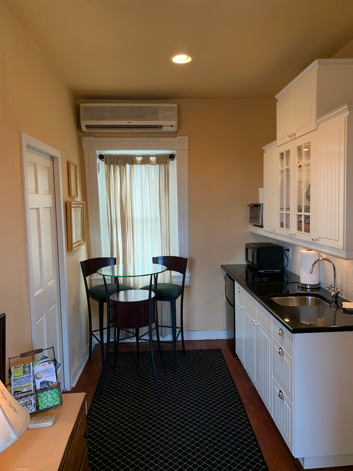 Welcome to Your Private Home in the City ONE BED, ONE BATH STUDIO APARTMENT IN AN OWNER OCCUPIED HOME: This fully furnished in-law’s suite combines historic charm with modern luxury. Behind a single door off the fourth floor landing is your own private space with a full size bed, bathroom, and a kitchenette. Just bring your suitcase, everything else you need is already here, including; Cookware, dishes, high thread count sheets, towels, soaps, and detergents and more. Washer/dryer available on site. Space is very private and quiet. Ideal for use as extended stay housing. When booking the studio apartment, you get more than just a place to sleep. All guests are welcome to enjoy the entire first floor of the house. Relax and enjoy a book, or access the Wifi network with your portable device. LOCATION: The Calvert Guest House, located in Baltimore’s historic Mount Vernon neighborhood, offers visitors a unique blend of Victorian charm, modern elegance, and downtown Baltimore convenience. The Calvert Guest House is only steps from everything historic Mount Vernon has to offer, including restaurants, theatre, museums, symphony hall, and nightlife. TRANSPORTATION: The central location also makes The Calvert Guest House an ideal hub from which to explore the rest of the city, and the region. Stops for the MARC, Amtrak, Lightrail, The FREE Charm City Circulator (charmcitycirculator.com), as well as the Johns Hopkins shuttle, are all within walking distance. There's a Zipcar station around the corner, and two more within a couple of blocks. Interstate 83 is only a four blocks from the house.