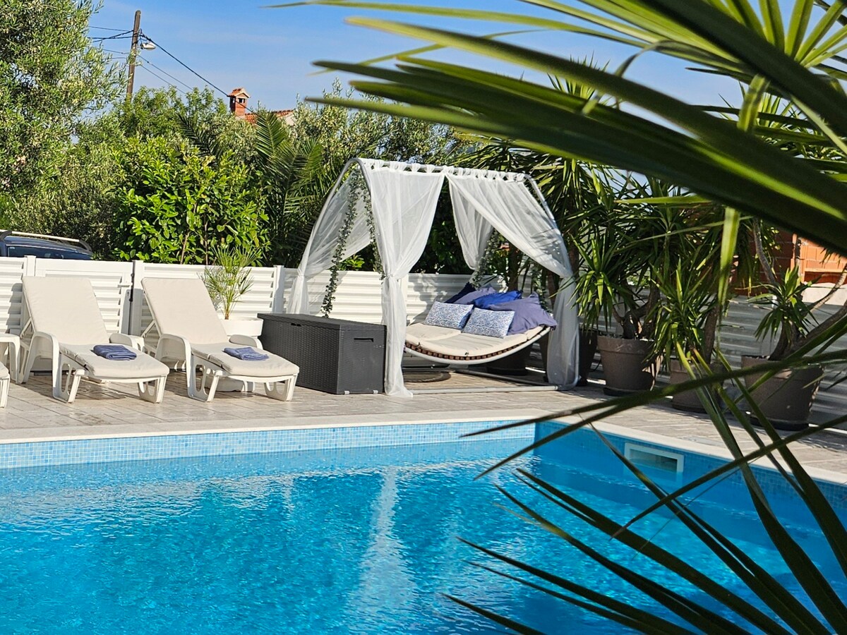 在這個舒適且獨特的住宿中放鬆身心。 它位於距離斯普利特市中心7公裏的小村莊。周圍環境平靜,可欣賞斯普利特的全景。別墅由4個房間組成,每個房間都有獨立浴室。一樓設有設備齊全的廚房、餐廳、客廳、客用廁所和配有洗衣機和烘乾機的儲藏室。旅館由30平方公尺的溫水泳池、燃氣烤架、戶外休閒休息室和8-10人的大桌子組成。