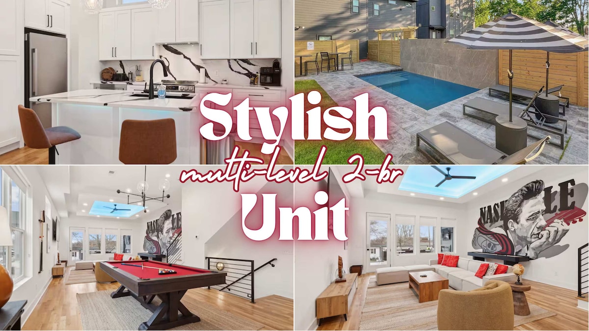 令人驚嘆的工業風格6床豪華公寓,配有巨大的玻璃車庫門。這間公寓曾在許多照片拍攝中亮相!位於一個名為1865的門禁社區,這是一個改建的150年歷史的煙草倉庫。享受免費停車位和泳池,配有戶外家具、烤架和酒吧區。大樓內也有Speakeasy Bar!使用我們的健身房,在觀景台上看星星。洗衣機/烘衣機。距離市中心百老匯酒吧僅2英里,距離范德堡大學僅1英里。步行2個街區就能到星巴克!