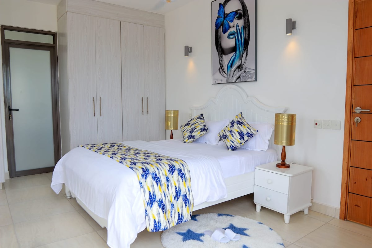 我們提供一間現代化的客用套房,位於一棟乾淨寬敞的別墅的二樓,步行5分鐘即可抵達Galu海灘。非常適合想在Diani安靜住宿的情侶,靠近各種酒吧、餐廳和超市。來享受美味的早餐,並在我們的游泳池中玩水! Karibuni sana!