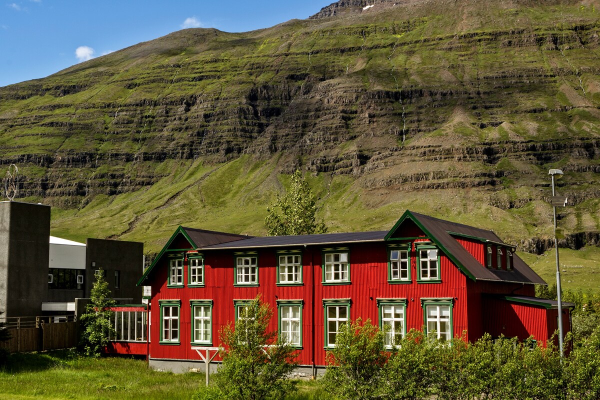 Enjoy your stay in our just renovated apartment in the historic old music school Steinholt. It is right in the heart of Seydisfjordur centre. Entrance is from a big terrace that can be enjoyed during the stay Apartment offers a well equipped kitchen & a cosy living room. Downstairs is a big bedroom for 2-4 people. A double bed & two single beds. Bathroom with shower and washing/Dryer machine is available. Spectacular mountain and fjord view. Ideal for couples, families or group of friends.