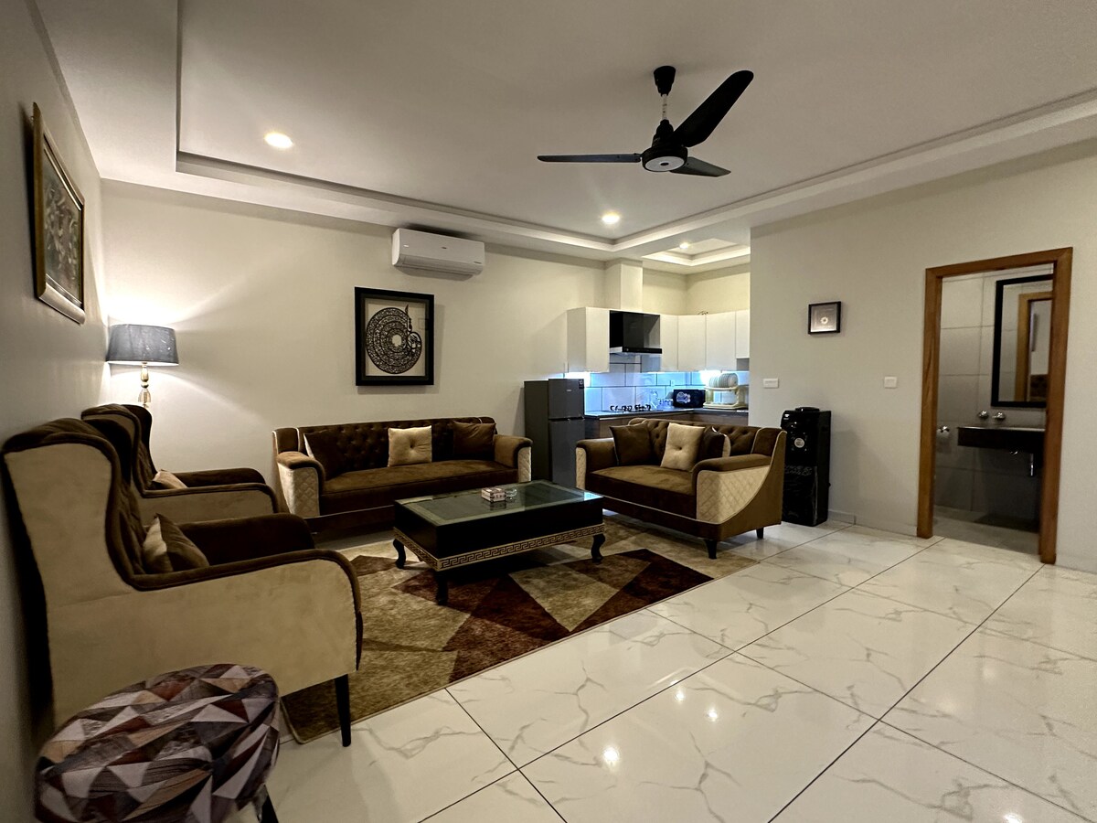 歡迎來到時尚舒適的度假勝地,距離伊斯蘭馬巴德國際機場12分鐘車程! 這間優雅的單臥室公寓專為商務旅客和奢華房客設計,融合了舒適、便利和精緻。 公寓摘要 優雅的起居空間–現代家具、時尚的用餐區域和舒適的休息室,供您在漫長的一天後放鬆身心。 高速Wi-Fi和智慧電視–使用高速網路和智慧電視保持連線和娛樂。