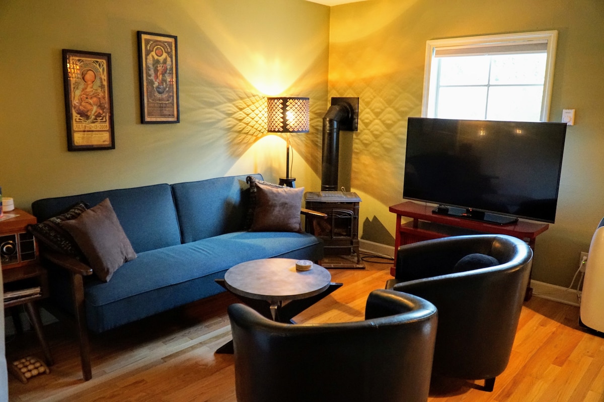 這間850平方英尺的小屋已有一個世紀的歷史,但12年前已完全更新,配備了適合時代的家具,給人一種時代(和安全)的感覺。早餐美食、藝術品、書籍和燃木爐讓它變得舒適。它坐落在半英畝的地方,所以有很多空間可供孩子們使用。它位於波特蘭西南部,距離市中心幾分鐘路程。這裡很安靜,非常適合工作或度假。室外火坑和花園使它獨一無二。這裡甚至還有一條兒童高空滑索。家庭聚會也可以。(請注意:每隻狗需支付60美元的費用。)