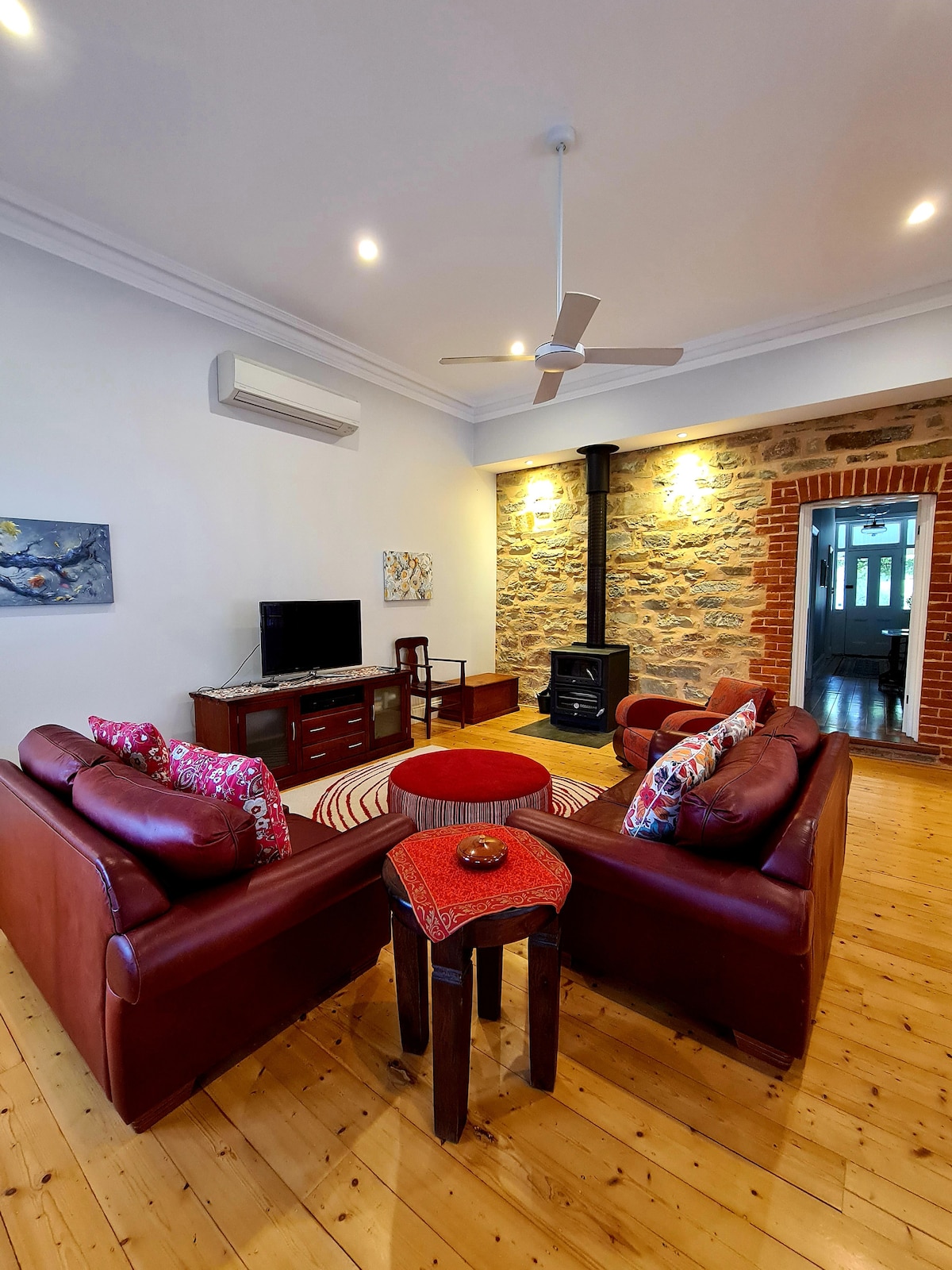 這是一棟建於1850年左右的寬敞石板建築,位於歷史悠久的Mintaro村(克萊爾谷)的一個大型綠葉區塊後方,經過翻新,包括現代舒適設施。您會很高興發現每個復古展示都有美麗的古董。步行即可抵達酒窖門餐廳和飯店。