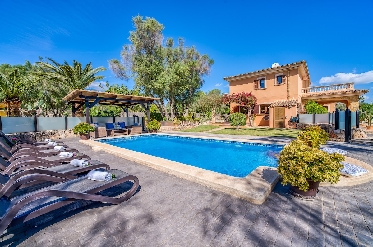 舒適的別墅,配有大露臺和美麗的景觀,可控制進出房源。享受私人泳池(鹽電解系統)和大花園的燒烤。 別墅位於一個有圍欄的莊園上,佔地20公頃( 200,000平方米)的農田和地中海森林,您可以在那裡欣賞馬匹和羊群。 遠離旅遊中心的喧囂,享受放鬆的景觀,距離島上最令人印象深刻的阿爾庫迪亞灣和穆羅海灘僅10分鐘車程。