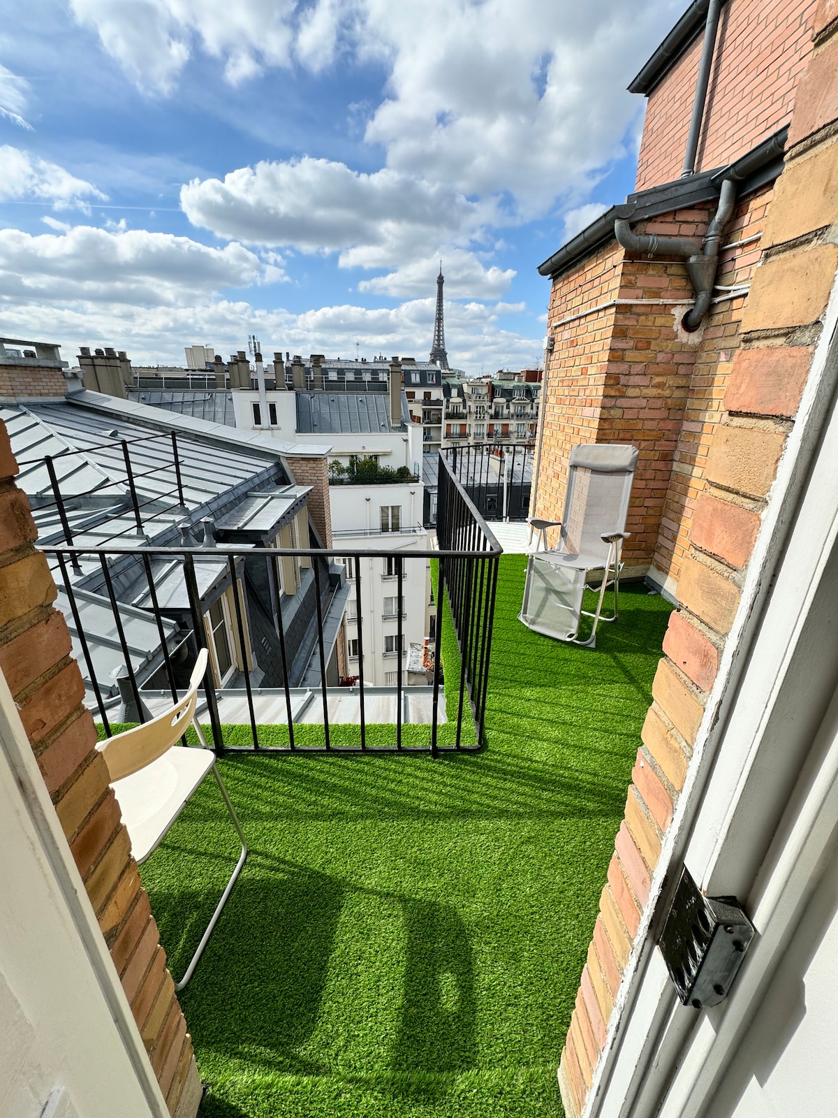 Duplex neuf décoré et totalement climatisé avec vue sur la Tour Eiffel et situé dans un petit immeuble familial de quatre étages. 3 chambres, 2 salles de bain, équipement haut-de-gamme. Newly decorated, fully air-conditioned duplex apartment with views of the Eiffel Tower, located in a small four-storey family building. 3 bedrooms, 2 bathrooms, top-of-the-range fittings.