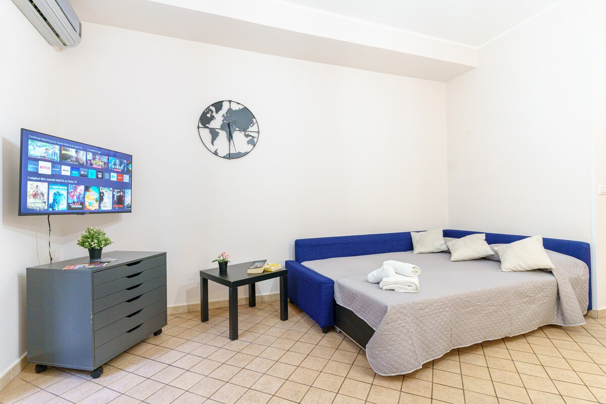 Located just 200 meters from the main square, the apartment is a peaceful retreat in the heart of Catania. Perfect for couples, travelers, and smart workers looking for comfort, style, and a central location to explore the city on foot. Bright and spacious, it features a comfy King Size bed, fully equipped kitchen (microwave, coffee machine, etc.), washing-machine & detergents, ultra-fast Wi-Fi, air conditioning, independent heating, and a 42’’ TV with Netflix and Prime Video included!