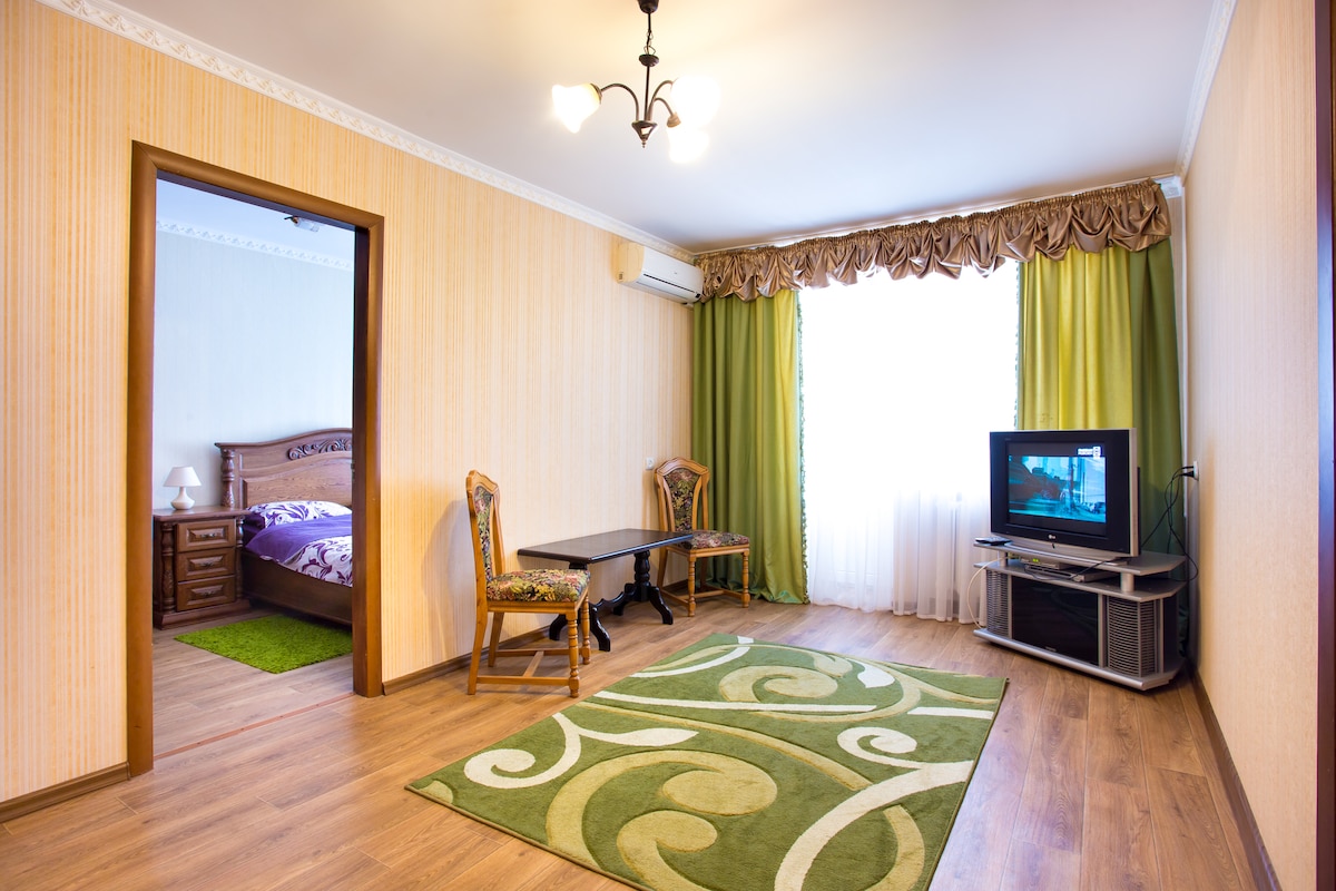 位於尼古拉耶夫市中心的歷史建築的一樓公寓。 寬敞的房間、高高的天花板、包括浴室的大窗戶、漂亮的家具和獨立的空調/暖氣,讓您在一年中的任何季節都感到舒適。 這是一個安靜的地方,早上有鳥兒在室外唱歌。 白天在公寓窗戶附近有停車位,對面有警衛停車位。 提供WiFi、IP電視、所有廚房用具、牀單和毛巾。