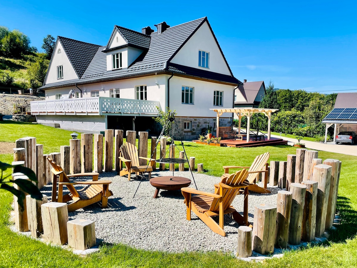 房子坐落在一個迷人的區域,四周環繞著森林和綠地。地理位置優越,距離歷史悠久的克拉科夫 50 公里,距離旅遊景點札科帕內 50 公里。 該地區有許多旅遊路線和滑雪場。 該地區非常適合戶外活動,許多小徑都適合徒步旅行。房子配有您完全放鬆所需的所有便利設施:撞球桌、花園和森林,還有按摩浴缸(需額外付費)。 我強烈推薦。