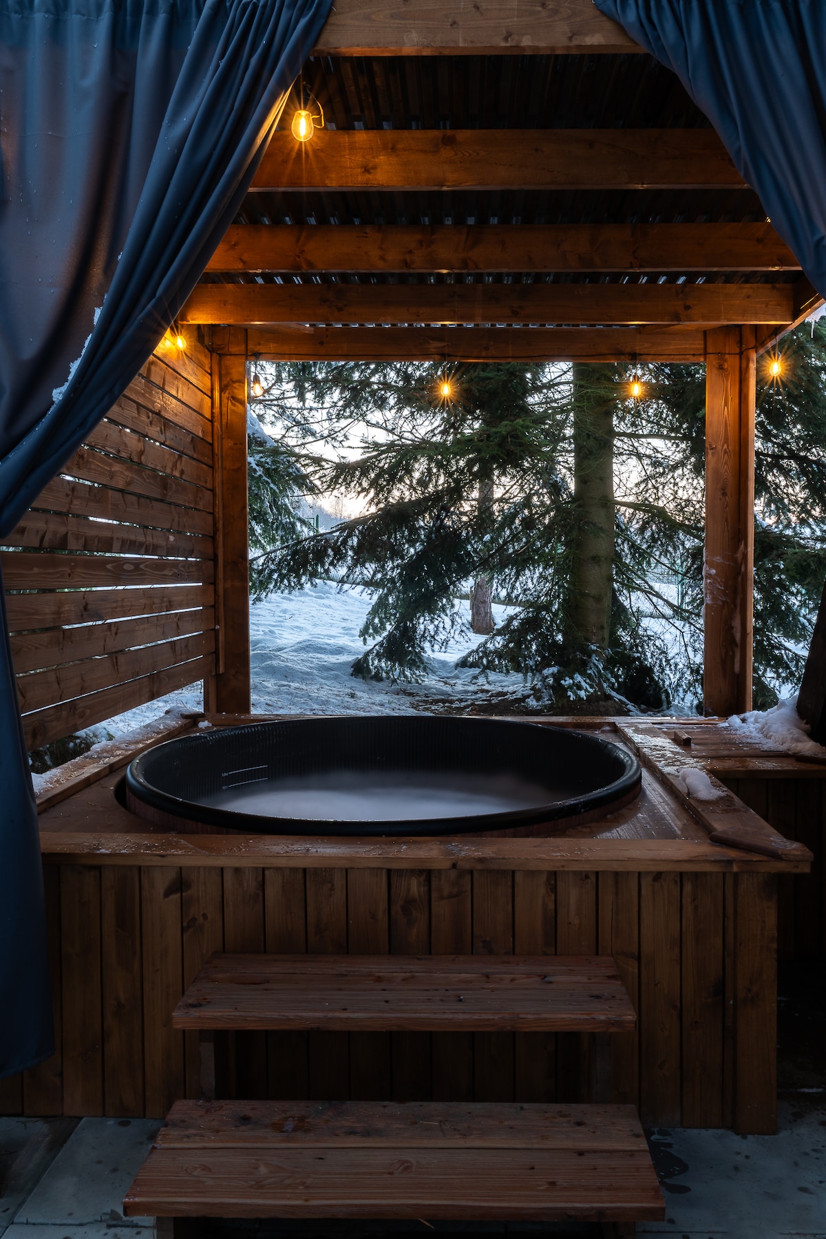 在露臺上,每位房客都有自己的休息室,可供戶外放鬆,還有一個私人電熱水浴缸,無需加熱(隨時熱) ,配有熱水浴缸和照明。 我們還有一個乾燥的芬蘭桑拿房、桌上足球、燒烤架和一個火坑。 從花園可以看到Raby Valley、Luboń、Tatras的美景。 孩子們有遊樂場、秋千、小屋和沙坑。 這個區域有圍欄,我們有停車位。
