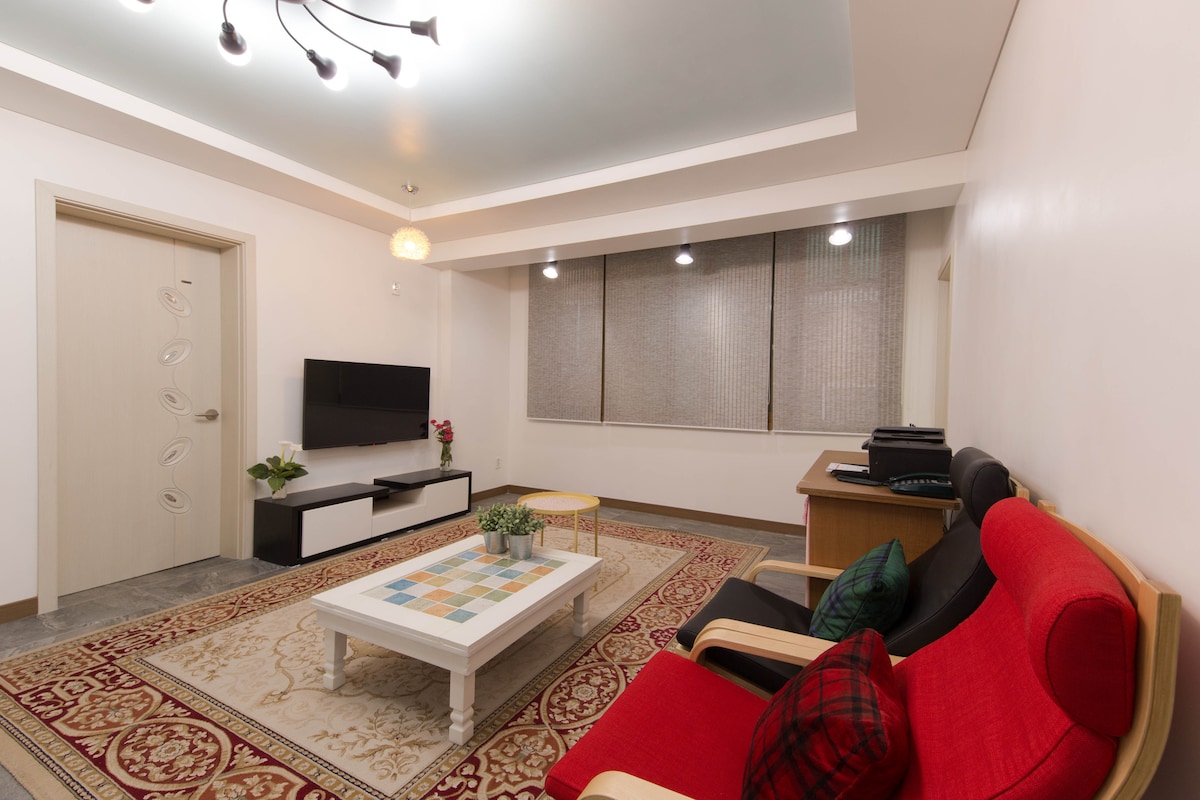 ✨ 70 平方公尺豪華頂樓公寓 | 這個寬敞的房源適合整個家庭入住。 在溫馨寬敞的客廳與親朋好友一起享受特別時光,感覺就像您在✨畫廊一樣。 5星級飯店大床+主臥室的獨立浴室、另一間房間的2張大床,甚至還有鋼琴! 免費✨停車位,可停一輛車,並提供工作空間,例如Wi-Fi和印表機。 開車20-30分鐘即可到達✨松島和仁川機場。 步行2分鐘即可抵達延壽站(火車),因此公共交通也很方便。 前面就有大型雜貨店✨✨,所以你可以便宜地購物~!