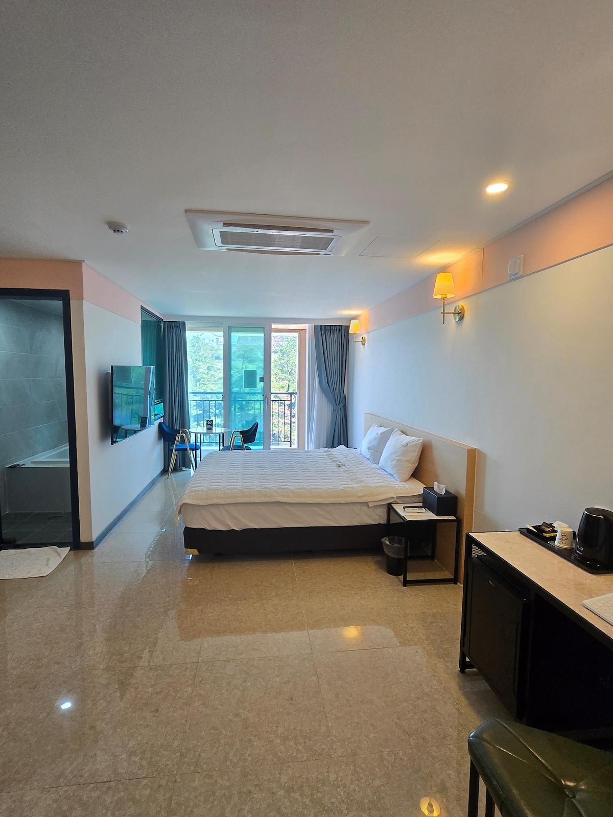 사랑스러운 이 공간의 매력에 빠져 사천 앞바다를 보며 제대로 힐링 가능한 곳으로 오셔요~ 사천CC8분 타니CC20분 사천바다케이블카10분 이 공간의 매력에 빠져보세요보세요. 주소 경남 사천시 서포면 사천대교로 364 잠보호텔 숙소 더블침대 3인시(깔개와 이불이 제공됩니다.)