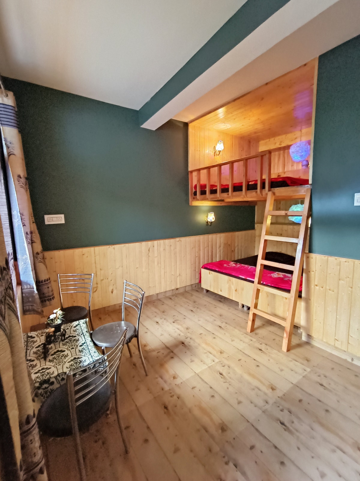 This home-stay is located at the most stunning views of manali. Walking away from hadimba temple and the nature walk. 3 kms from the mall road. 2 kms walk to the old manali bridge. Our property is 2 cottages where we have these floors of 2-3 rooms each with private balconies and beautiful outdoor seatings. This one is at the first floor. We have a in house cook where you can get anything made on order or choose from our in house menu.