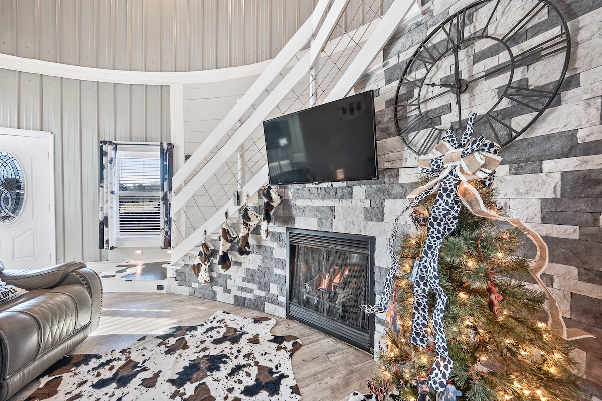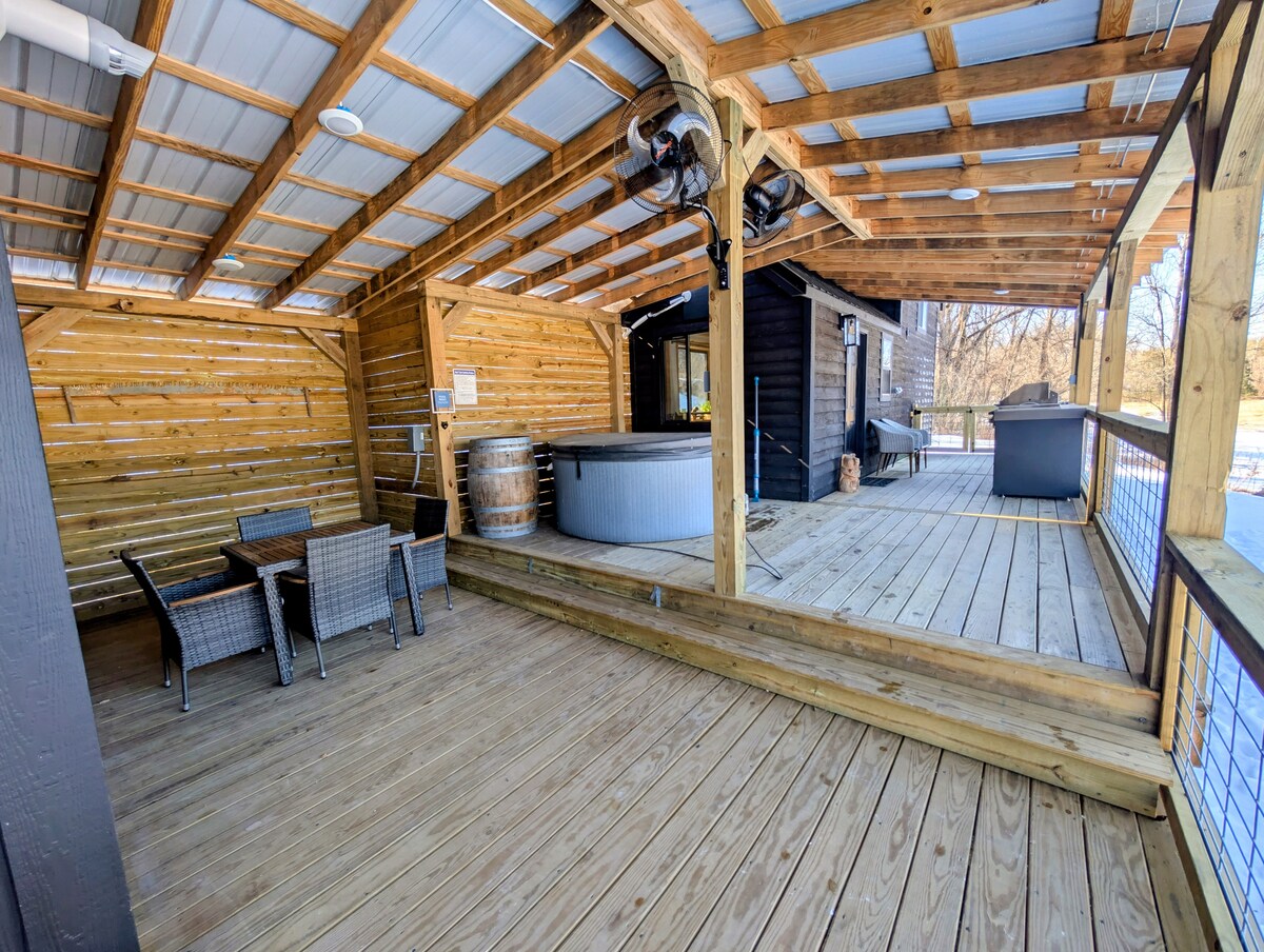 Our cabin is built out of old wood and doors found on the farm. Because I am such a cold natured person, I installed heated floors and a heated towel bar in addition to the mini-split and electric fireplace! The cabin is surrounded by pastures that are the home to our cows, horses, goats, pot belly pig, and chickens. The highlight of a stay at BWJ Cabin would be to sit on the front porch in a rocking chair, day bed swing or hot tub looking out over the landscape and do nothing.