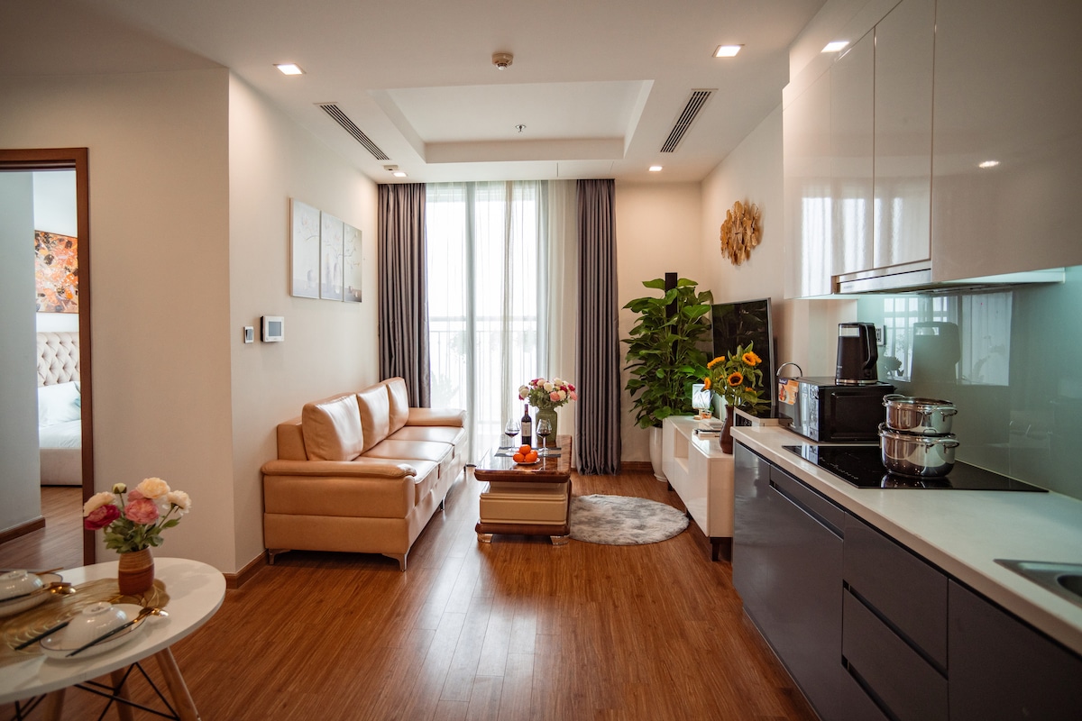 This is a spacious studio apartment located on the 22nd floor of block C2, D’Capitale Complex. With an area of 35m2, the apartment with wooden floors creates a cozy but still airy feeling with a large balcony. Beside the queen bed, the apartment has 1 bookshelf, a large sofa, and a dining table for 2 people. The kitchen is fully equipped with kitchen utensils, suitable even if you have a long stay. The apartment also has a smart SAMSUNG TV with Netflix and fast internet for remote working.