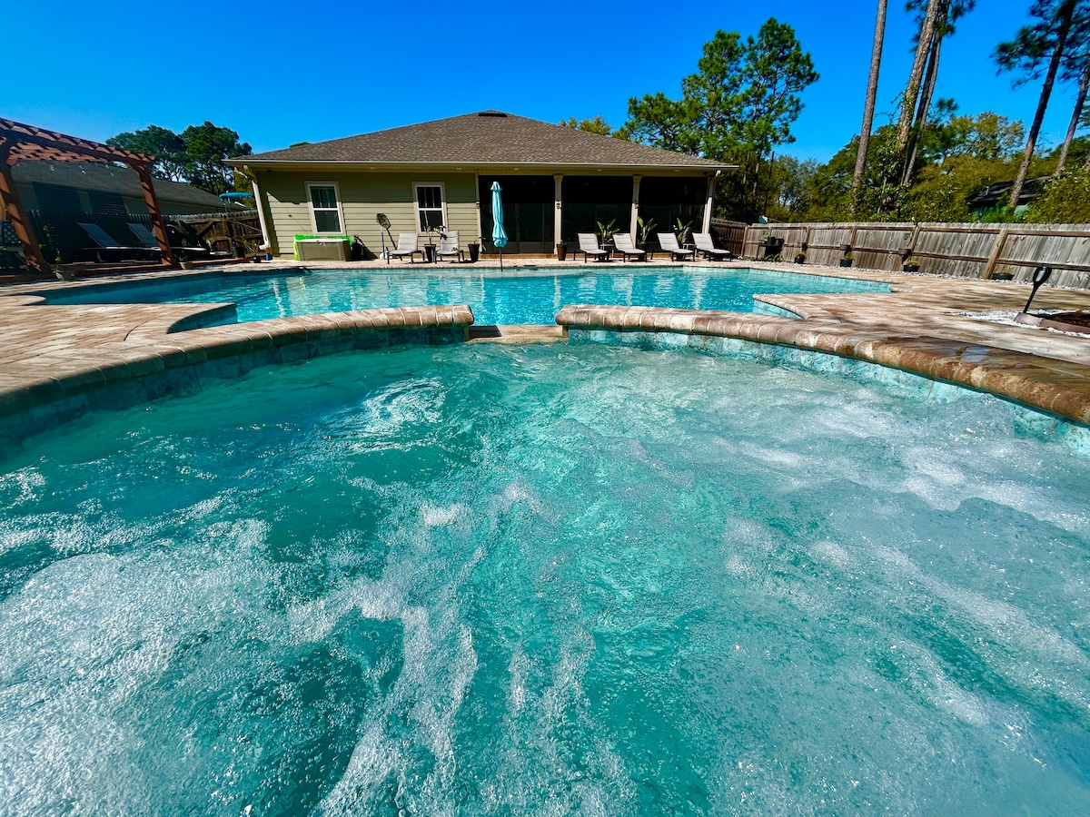 在寬敞的奢華中放鬆身心! 逃離到適合家庭入住的3,000平方英尺綠洲,擁有巨大的泳池和熱水浴缸,無限的樂趣,距離納瓦拉海灘10分鐘。 泡澡、挑戰朋友打乒乓球,或在 Pac-Man 機器和 Nintendo Switch 上對戰。 在我們的吊牀上放鬆身心,在玉米坑中放鬆身心,或享受棋盤遊戲。 這個巨大的房源為難忘的住宿體驗提供了一切!