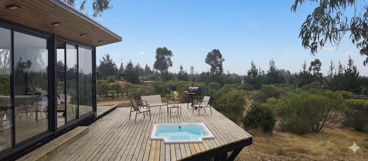 在這個難忘的假期中與大自然建立聯繫。 可供4人入住的迷你屋,配有泳池和海景,四周環繞著森林,佔地6,000平方公尺。 非常適合情侶、有小孩的家庭或想在獨特景觀下工作的人。 它位於森林中Pupuya最好的街區,靠近大海。 靠近Pupuya濕地和Matanzas ,是智利最適合風箏衝浪和衝浪的地方之一,以及餐廳。