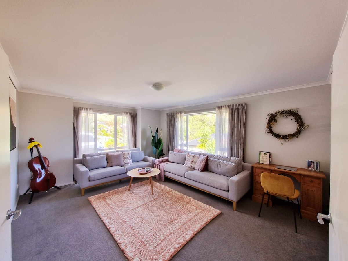 房子坐落在Britannia Heights ,可俯瞰塔斯曼灣,可欣賞美麗的海景和戶外游泳池。 我們的房源位於我家的一樓,提供3間臥室、浴室和大型休息室和小廚房。步行20分鐘即可抵達市區。步行5分鐘即可抵達海邊。休息室有Netflix和Sky TV ,還有烤肉架供您使用。