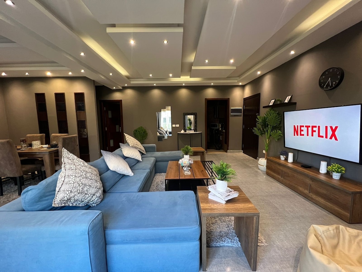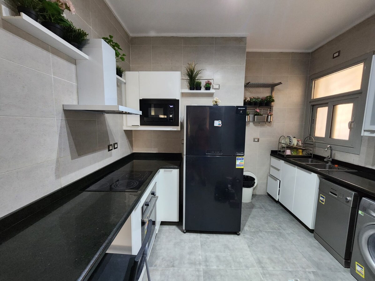 這是一間位於新開羅第五區別墅的豪華公寓。 3間臥室,有4張床。 2間浴室。 配有所有電器的廚房。 全套空調。 免費WiFi。 電梯 2分鐘即可抵達Concord plaza Mall , 2 分鐘即可抵達南 90 街, 距離Waterway Mall 5分鐘路程 3分鐘到AUC和未來的大學, 步行2分鐘即可抵達Bakry、雜貨店、市場 距開羅機場15分鐘 距離開羅節15分鐘